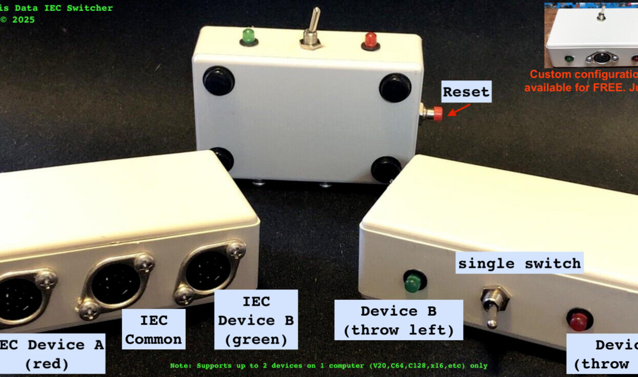 Made brand new and by hand, with high quality parts and a Lifetime Guarantee, the Acutis Data IEC Switcher allows you to easily switch between 2 IEC serial devices (1541, 1541-II, 1571, 1581, SD2IEC, Pi1514, IEC hard drives, printers, etc) on your Commodore 64, 128, VIC 20, Commander X16, etc both on the same channel!This device is for sharing 2 IEC devices to one computer. However, an upgrade will allow you to share 1 device between 2 computers. See below for more info.